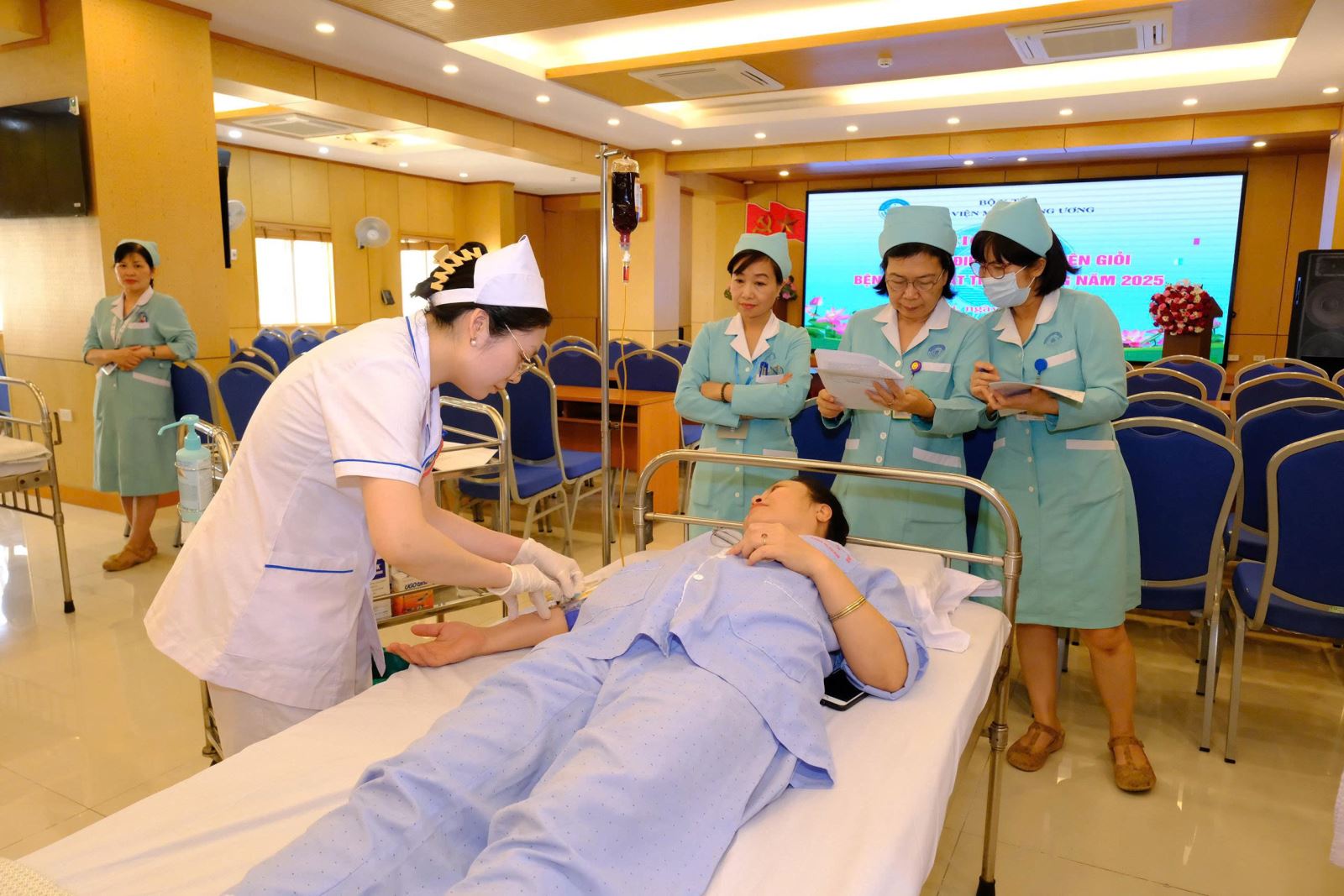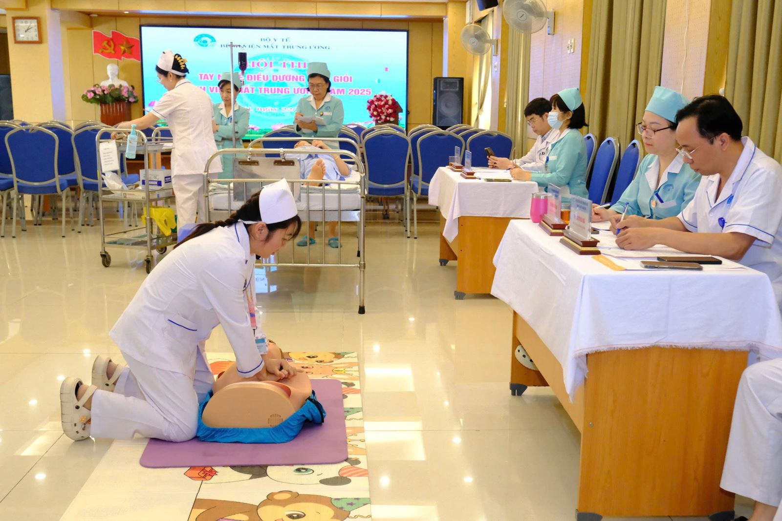 Tại Hội thi này, các “thí sinh” điều dưỡng viên chủ yếu tập trung các 5 quy trình kỹ thuật chuyên môn: Thay băng mắt, cấp cứu ngừng hô hấp tuần hoàn, rửa tay sát khuẩn nhanh, đo dấu hiệu sinh tồn và tiêm tĩnh mạch.