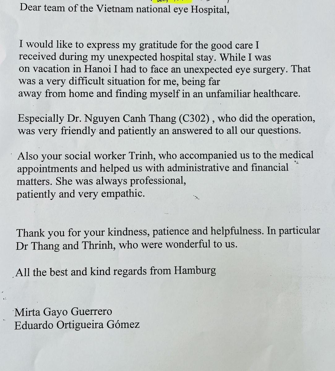 Sau khi trở lại Hamburg (Đức), bà Eduardo O. Gómez đã gửi thư cảm ơn kèm hình ảnh tới hộp thư của Bệnh viện Mắt Trung ương (bvmtw@vnio.vn), bày tỏ sự hài lòng và biết ơn đối với sự chăm sóc mà bà đã nhận được trong thời gian điều trị tại Việt Nam.