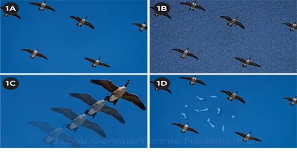 Mô phỏng: (1A) bình thường (1B) tuyết thị giác, mô tả nền hình ảnh là những chấm nhỏ màu xám, nhấp nháy (điểm ảnh hóa); (1C) palinopsia - hiện tượng lưu ảnh: sự tồn tại của hình ảnh sau khi kích thích thị giác không còn nữa; và (1D) hiện tượng entoptic - chấm chuyển động nhỏ trên nền xanh: nhận thức thị giác phát sinh từ các nguồn bên trong mắt chứ không phải từ thế giời bên ngoài (bong dịch kính, vẩn đục dịch kính, phát sáng do dụi mắt, thấy vật thể trôi nổi)